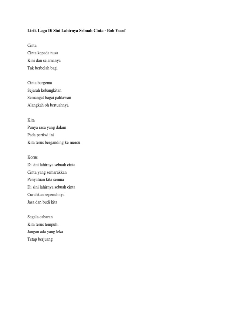 Tetap di sini dan jangan kau pergi karena hatiku sudah. Lirik Lagu Jika Ku Buka Mata Ini Ku Ingin - Lirik Lagu Disini Lahirnya Sebuah Cinta - Lirik Lagu Di. Lirik Lagu Di Sini Lahirnya Sebuah Cinta - Bob Yusof Cinta Cinta kepada nusa Kini dan selamanya Tak berbelah bagi Cinta bergema Sejarah kebangkitan Semangat bagai pahlawan Alangkah oh bertuahnya Kita Punya rasa yang dalam Pada pertiwi ini Kita terus berganding ke mercu Korus Di sini lahirnya sebuah cinta Cinta yang semarakkan Penyatuan kita.